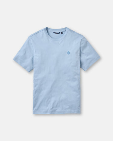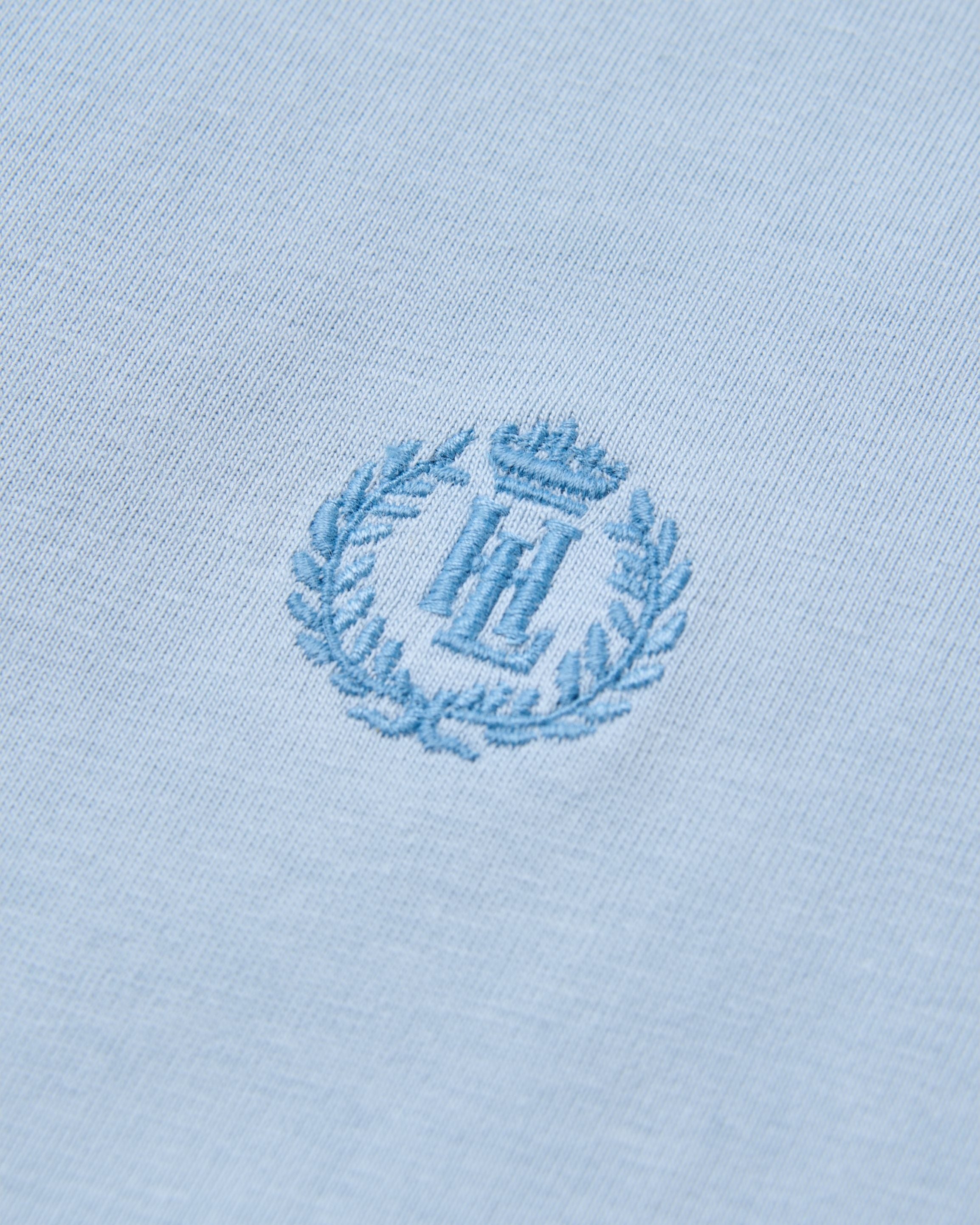 Classic short sleeve fog blue T-shirt in single jersey organic cotton. This style features the Laurel and Crown direct embroidered logo at left chest...
