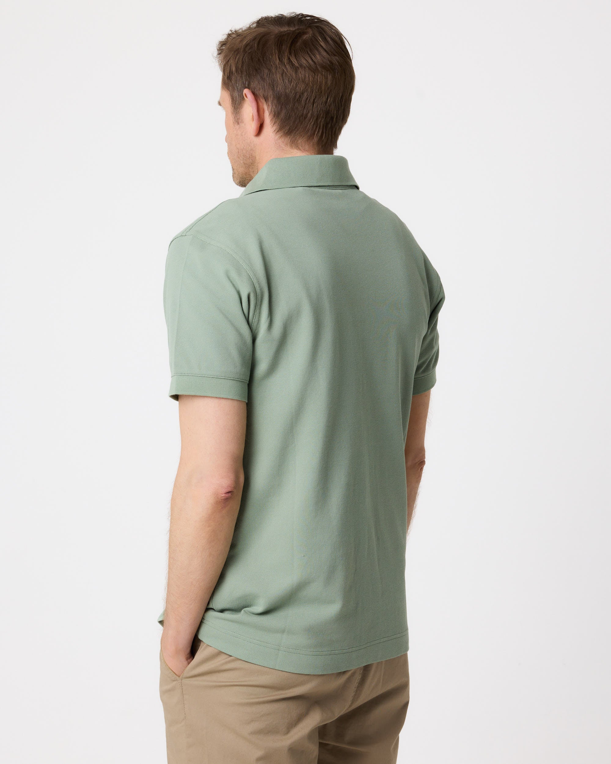 Classic pale jade short sleeve polo in a pique fabric with knitted rib collar & cuffs. 100% Organic Cotton with button closure on the centre fron...