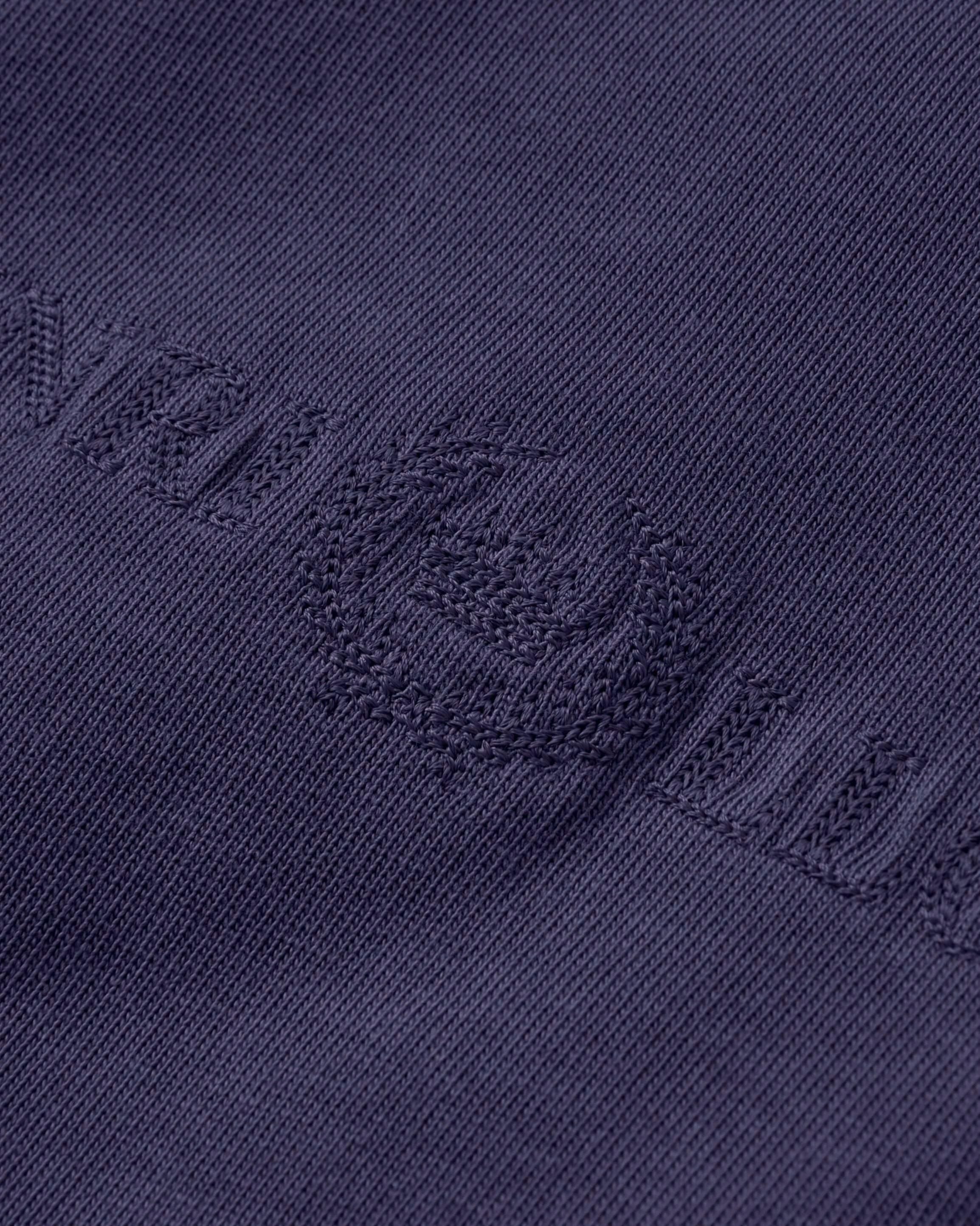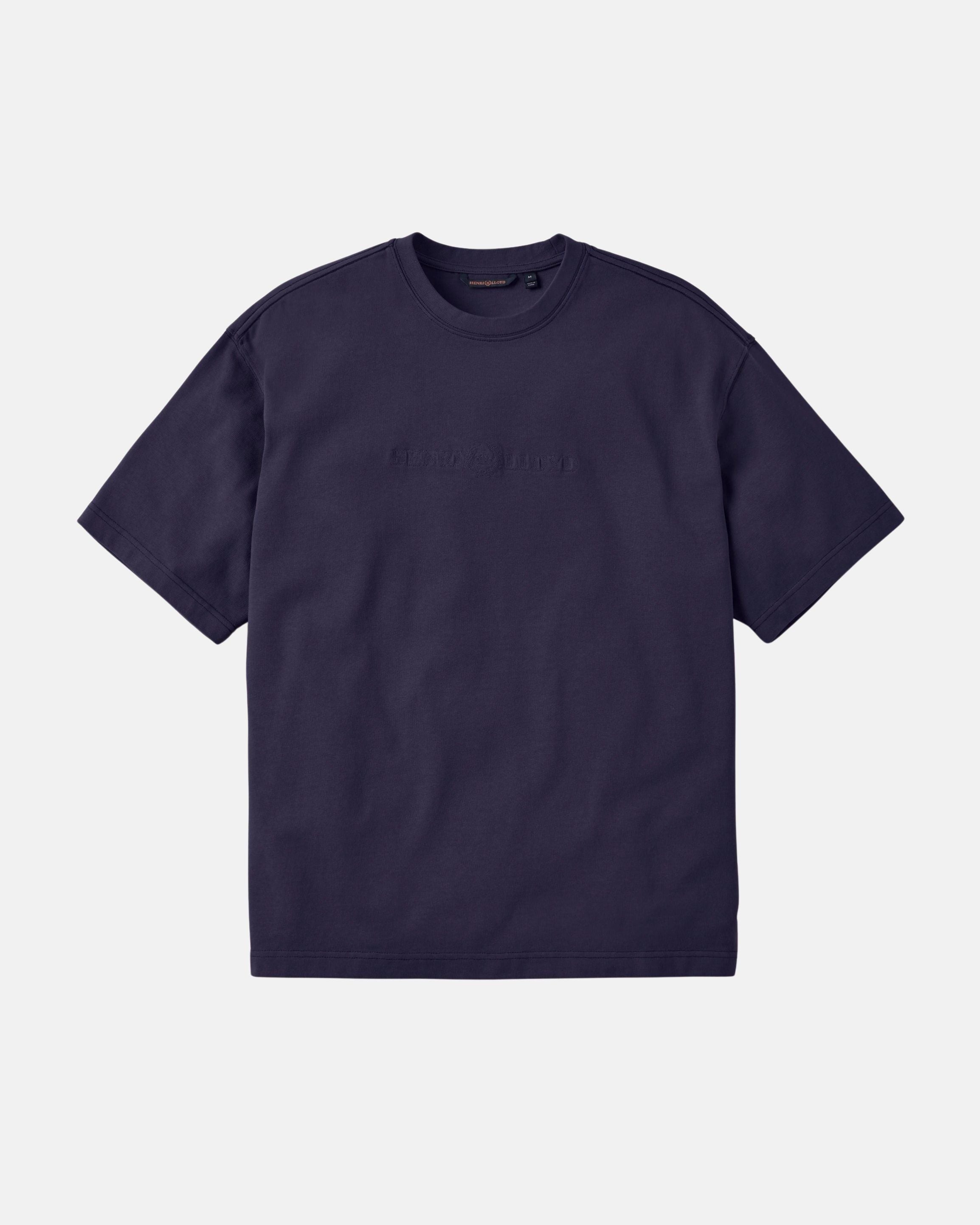 The heavyweight 320gsm single jersey fabric, ribbed collar, and oversized, relaxed fit, along with large distinctive chain stitch branding at the chest, make this Dark Navy T-shirt a versatile choice for casual outings or as a layered piece in cooler conditions.