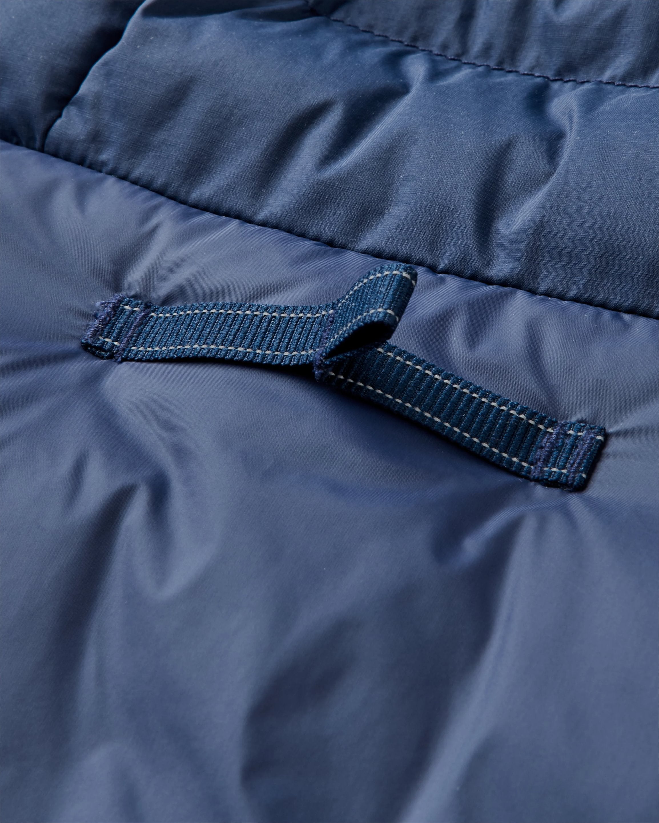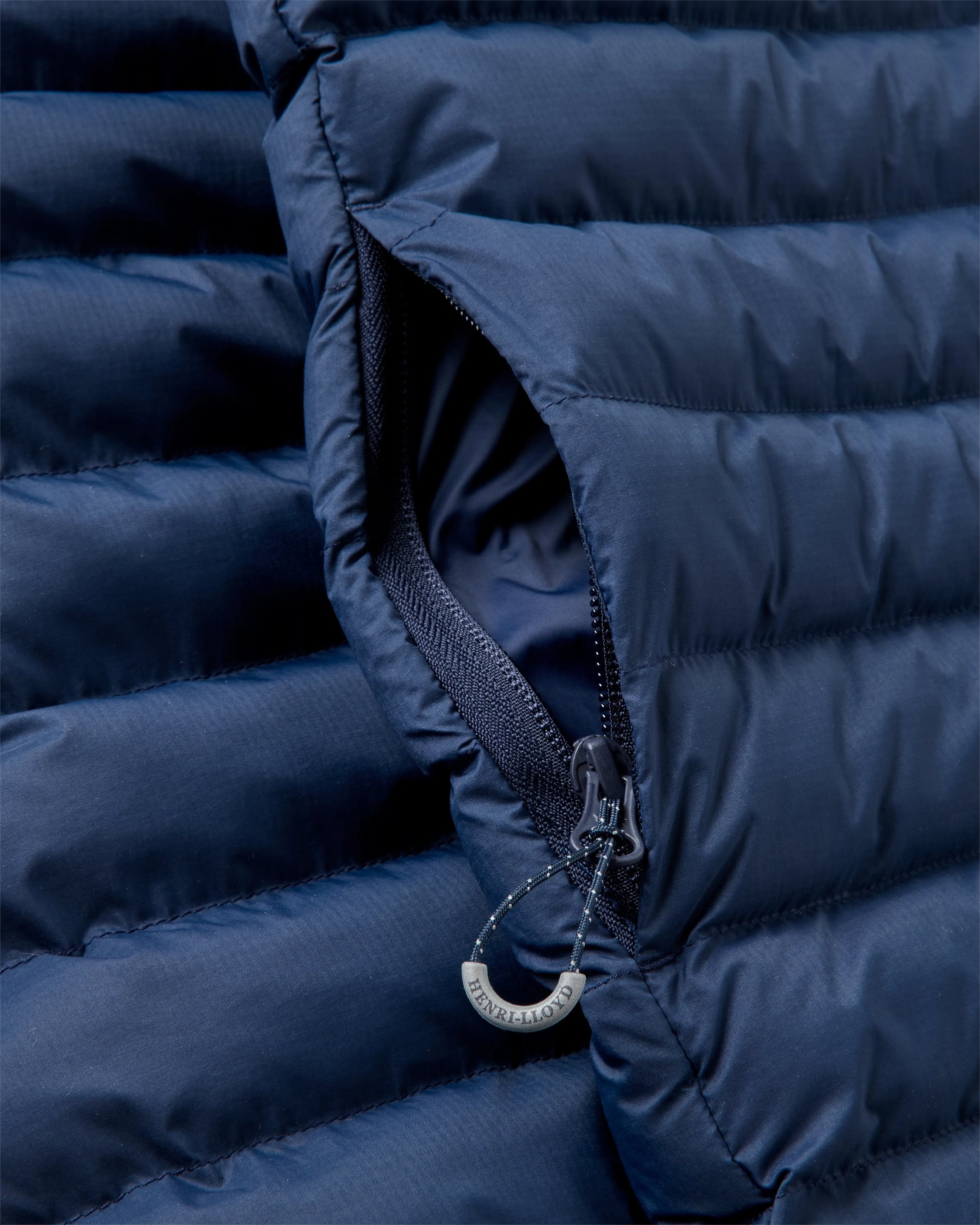The Navy Bergen Hooded Jacket is a technical mid-layer that balances lightweight comfort with sustainable performance. It’s constructed from 100% post-consumer recycled NetPlus® ripstop and a 47gsm water-based PU coating, paired with a 37gsm recycled polyester trim. The jacket is treated with a C0 DWR finish to provide light water resistance, and is insulated with 95g REPREVE® 100% recycled PET loose fill—offering effective warmth without adding weight or bulk, ideal for year-round layering.