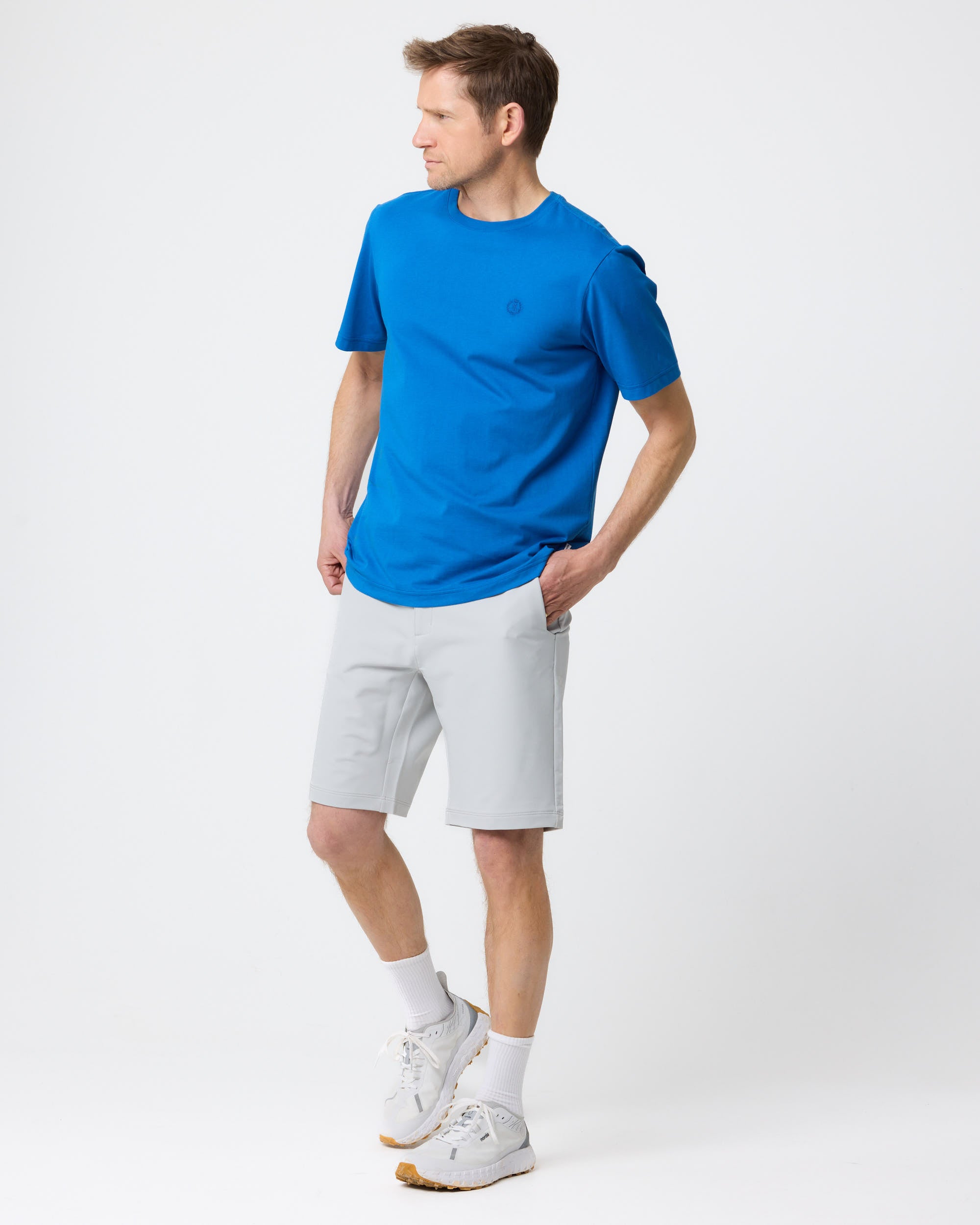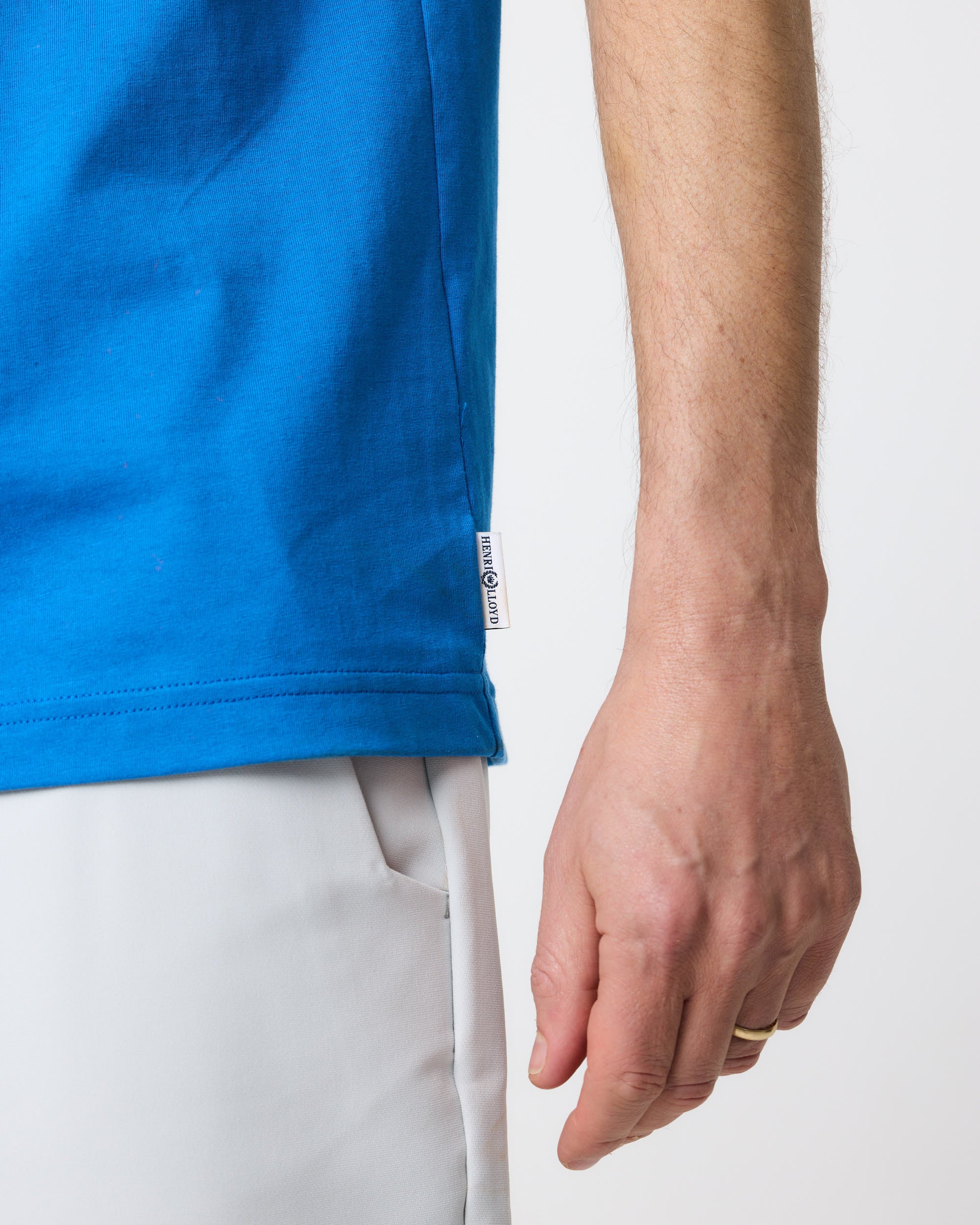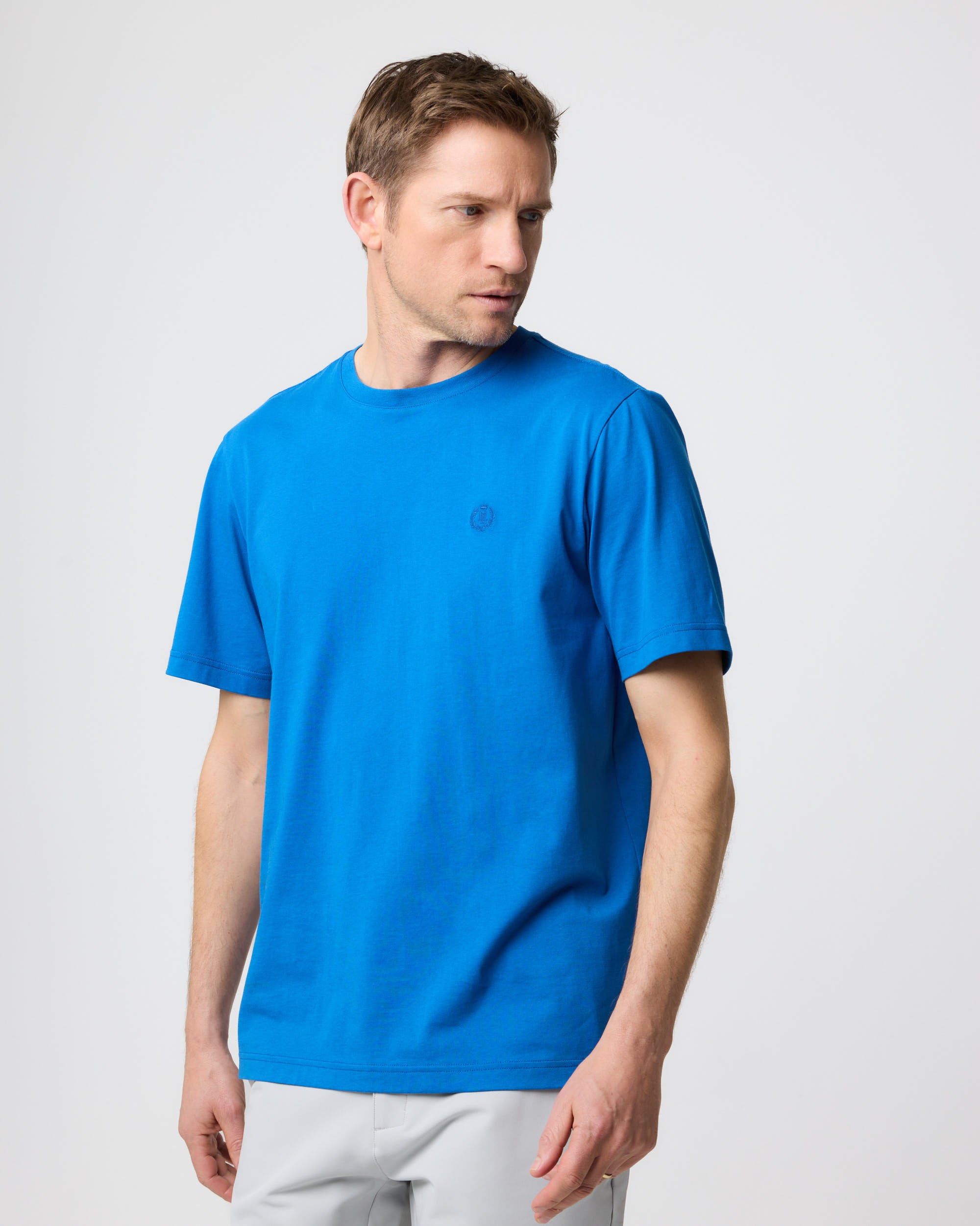 Classic short sleeve marine blue T-shirt in single jersey organic cotton. This style features the Laurel and Crown direct embroidered logo at left chest and side seam branded flag.