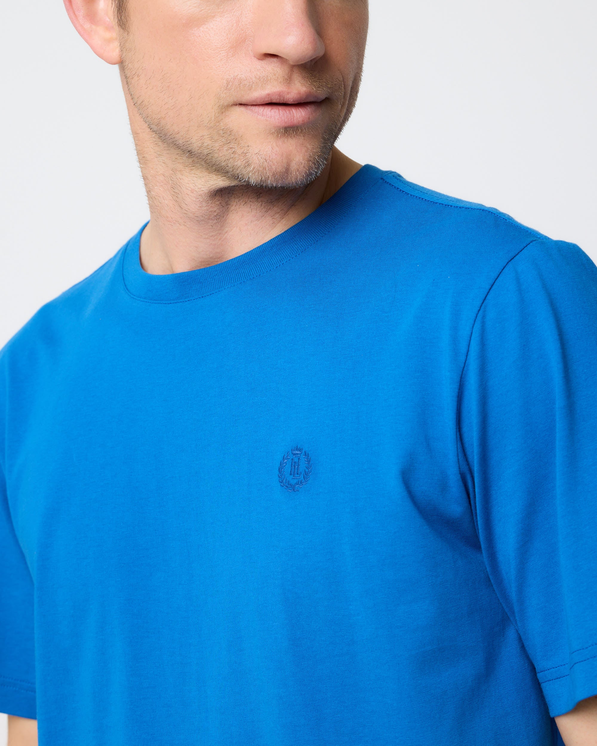 Classic short sleeve marine blue T-shirt in single jersey organic cotton. This style features the Laurel and Crown direct embroidered logo at left ch...