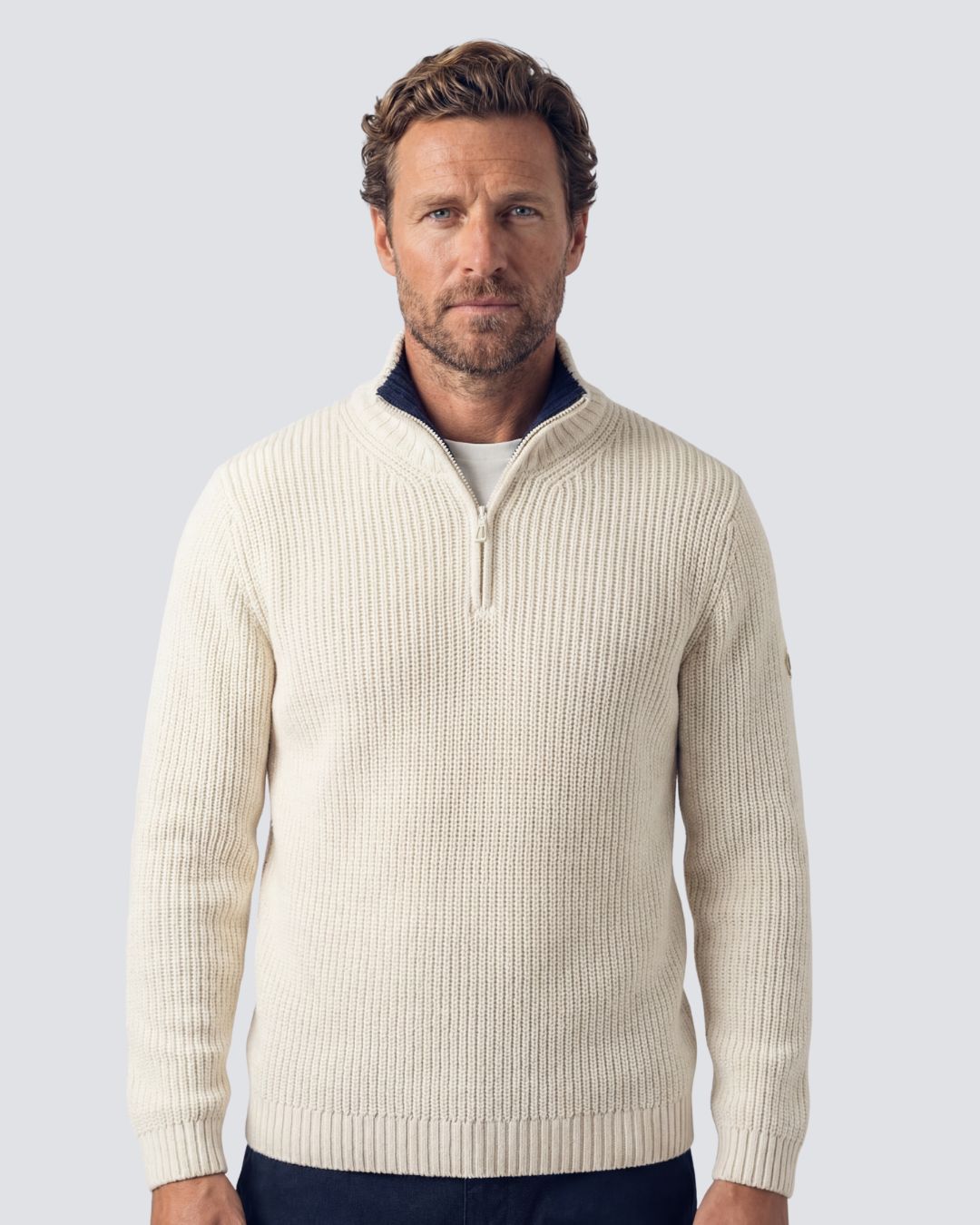 A contemporary interpretation of classic ribbed knitwear, the Golant Quarter Zip in Ecru balances texture and versatility. Made from 5-gauge organic cotton with a ribbed high neck and quarter zip, it’s ideal for layering across seasons. A recycled diamond laurel and crown embroidery on the left arm adds a clean, considered finish to this heritage-inspired piece.